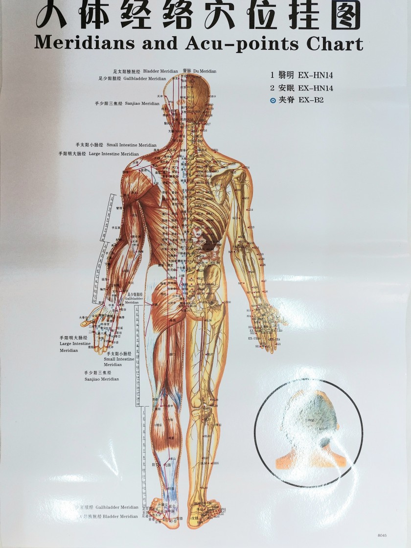 מפת דיקור גבית. הנקודות מוסמנות בהאנגלית