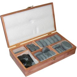 סט איכותי עם מגוון רחב של חלוקי נחל מסוג בזלת מעובדים וחלקים לנוחות הטיפול מגיע בקופסאת עץ נוחה לשימוש